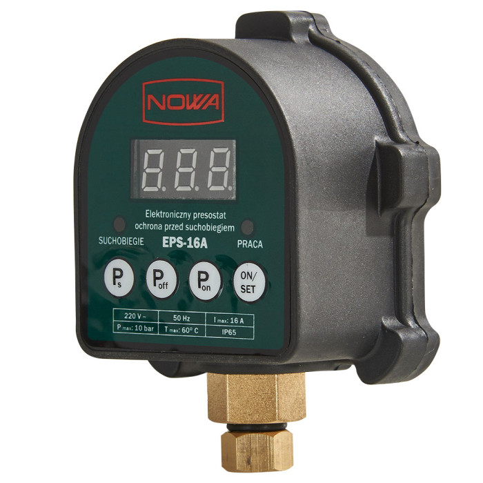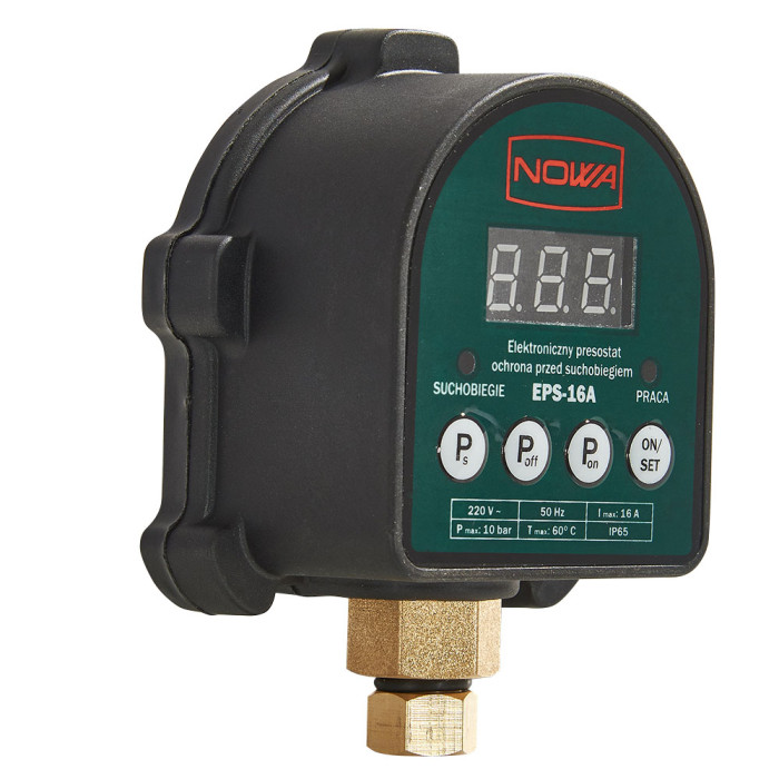 Автоматический электронный контроллер давления NOWA EPS-16A предназначен для поддержания стабильного давления воды в бытовых системах водоснабжения. Устройство обеспечивает автоматическое управление работой электрического насоса — включает его при снижении давления и отключает при прекращении водоразбора, одновременно защищая насосное оборудование от работы «всухую» при отсутствии воды в магистрали.