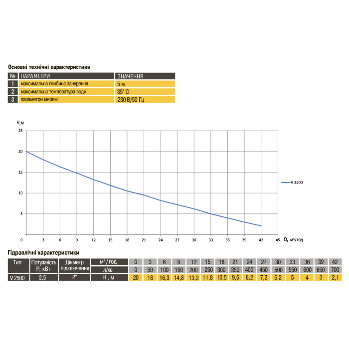 Н = 20,0 м, Q = 42 м3/ч (700 л/мин), Р = 2500 Вт, медная обмотка, глубина погружения до 5 м, подключение 3”, без режущего механизма