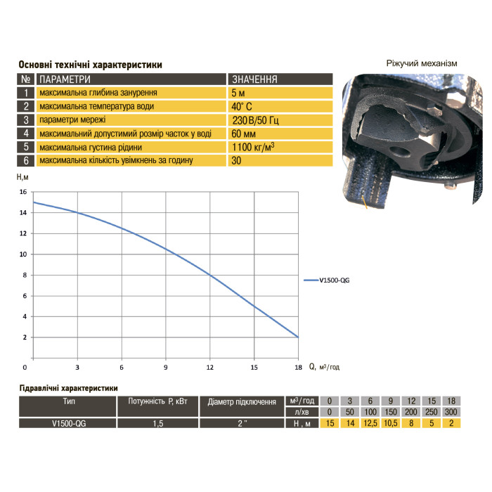 Н = 15,0 м, Q = 15 м3/ч (250 л/мин), Р = 1500 Вт, медная обмотка, глубина погружения до 5 м, подключение 2”, с режущей насадкой