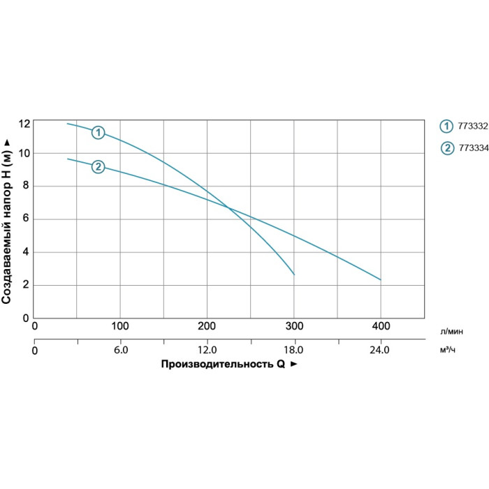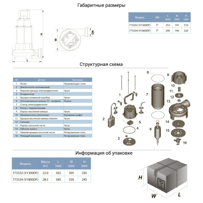 Н = 12 м, Q = 18 м3/ч (300 л/мин), Р = 1300 Вт, медная обмотка, глубина погружения до 5 м, полимерный патрубок 2”, с поплавковым выключателем, с режущим механизмом