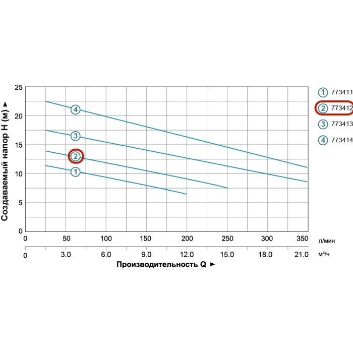 Н = 14 м, Q = 16,5 м3/ч (275 л/мин), Р = 750 Вт, медная обмотка, глубина погружения до 5 м, чугунный патрубок 2”, без поплавкового выключателя, без режущего механизма