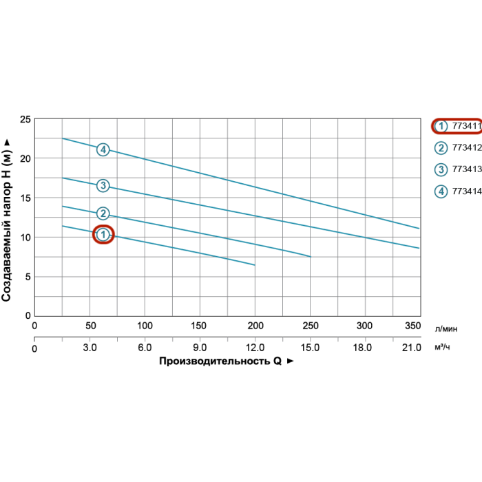 Н = 12 м, Q = 14,5 м3/ч (242 л/мин), Р = 550 Вт, медная обмотка, глубина погружения до 5 м, чугунный патрубок 2”, без поплавкового выключателя, без режущего механизма
