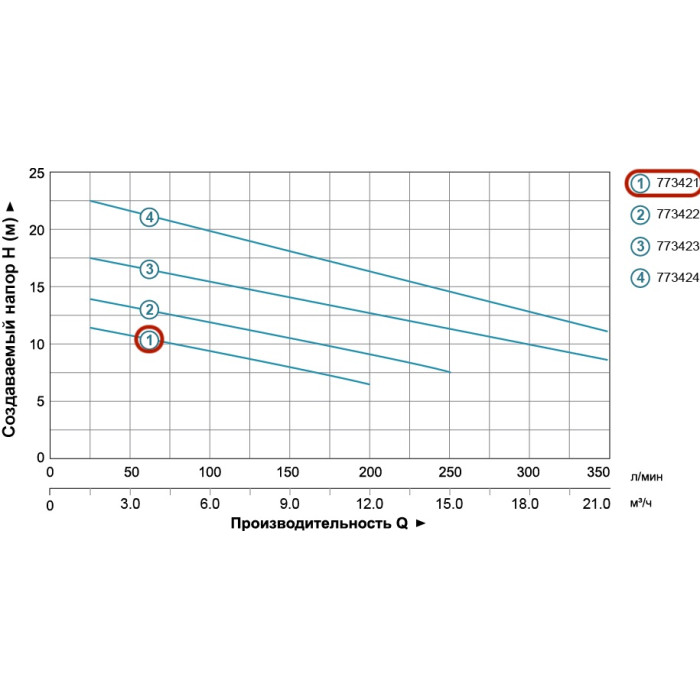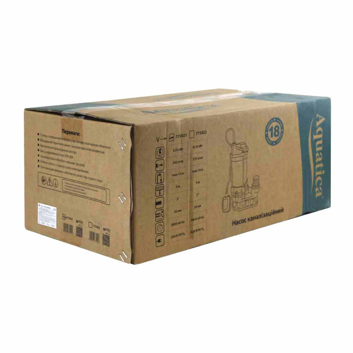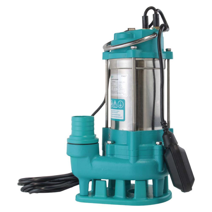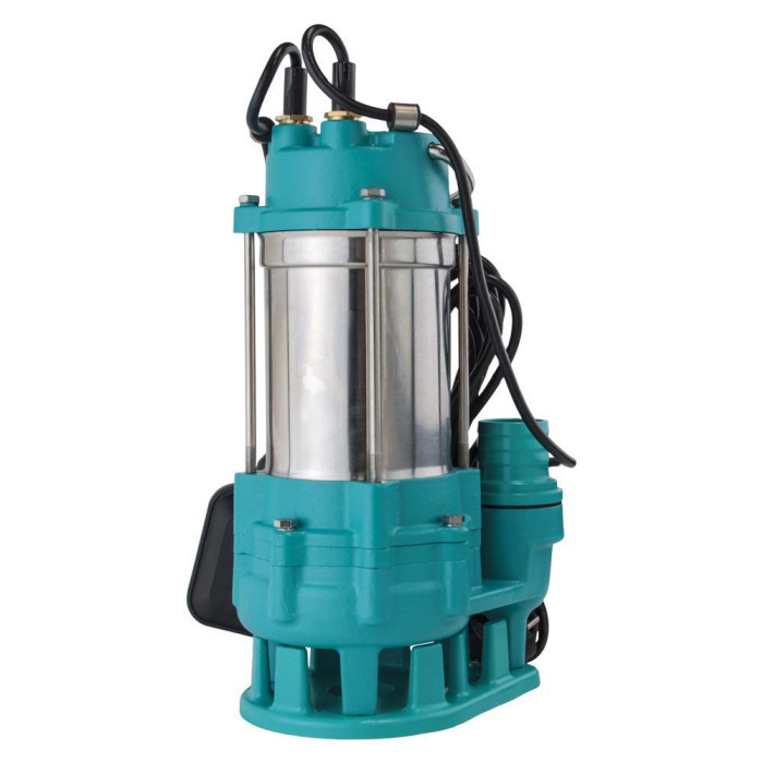 Н = 12 м, Q = 14,5 м3/ч (242 л/мин), Р = 550 Вт, медная обмотка, глубина погружения до 5 м, чугунный патрубок 2”, с поплавковым выключателем, без режущего механизма
