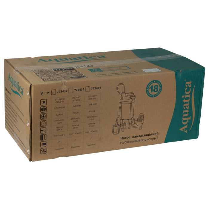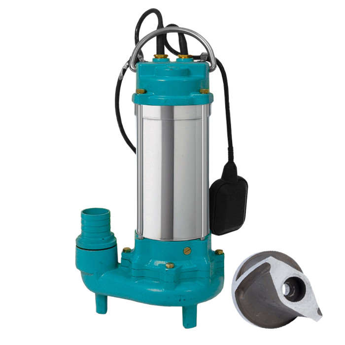 Н = 15,5 м, Q = 18 м3/ч (300 л/мин), Р = 1100 Вт, медная обмотка, глубина погружения до 5 м, чугунный патрубок 2”, с поплавковым выключателем, с режущим механизмом