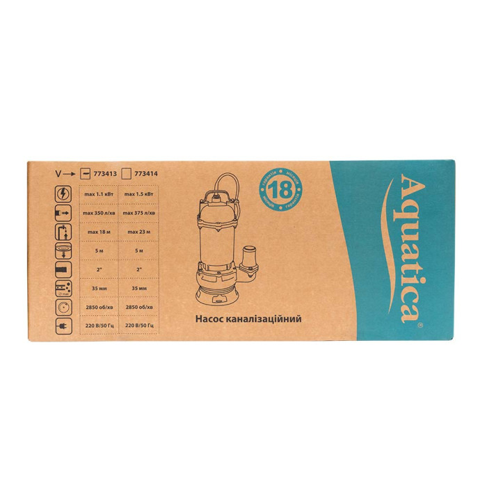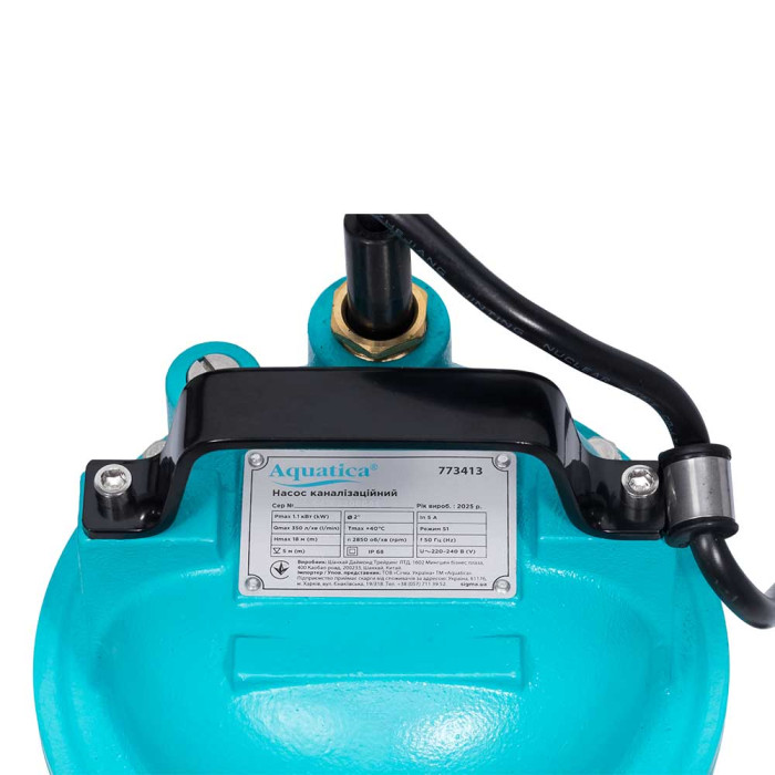Н = 18 м, Q = 21 м3/ч (350 л/мин), Р = 1100 Вт, медная обмотка, глубина погружения до 5 м, чугунный патрубок 2”, без поплавкового выключателя, без режущего механизма