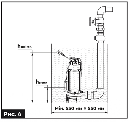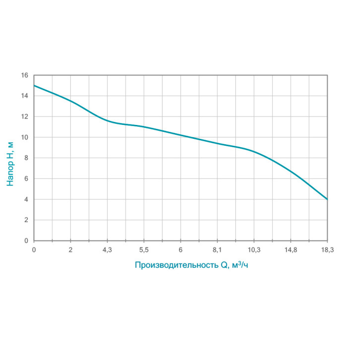 Н = 15 м, Q = 19,2 м3/ч (320 л/мин), Р = 1800 Вт, алюминиевая обмотка, глубина погружения до 5 м, подключение 2”, с поплавковым выключателем, с режущим механизмом
