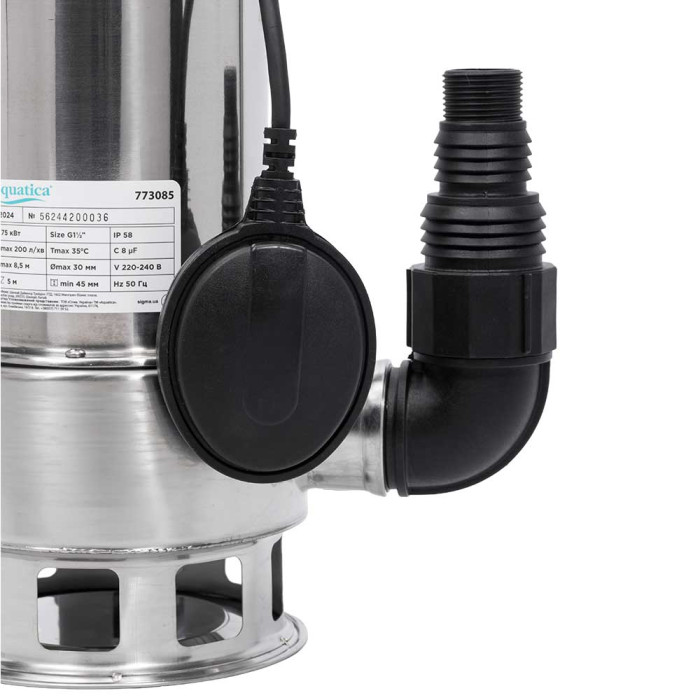 Н = 8,5 м, Q = 12 м3/ч (200 л/мин), Р = 750 Вт, глубина погружения до 5 м, диаметр бокового штуцера 1½” – 2”