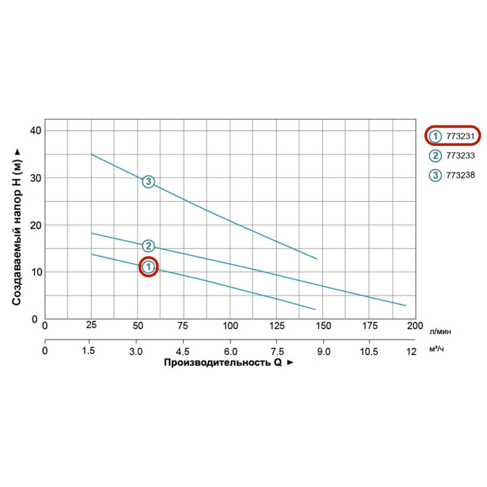 Н = 16 м, Q = 9 м3/ч (150 л/мин), Р = 370 Вт, глубина погружения до 5 м, диаметр штуцера 1”