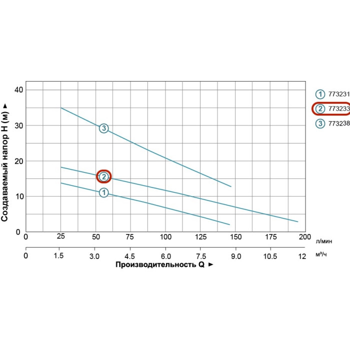 Н = 20 м, Q = 12,6 м3/ч (210 л/мин), Р = 550 Вт, глубина погружения до 5 м, диаметр штуцера 1”