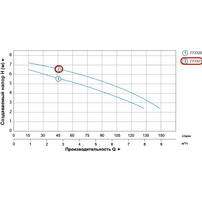 Н = 7,5 м, Q = 9 м3/ч (150 л/мин), Р = 250 Вт, глубина погружения до 5 м, диаметр штуцера 1½”