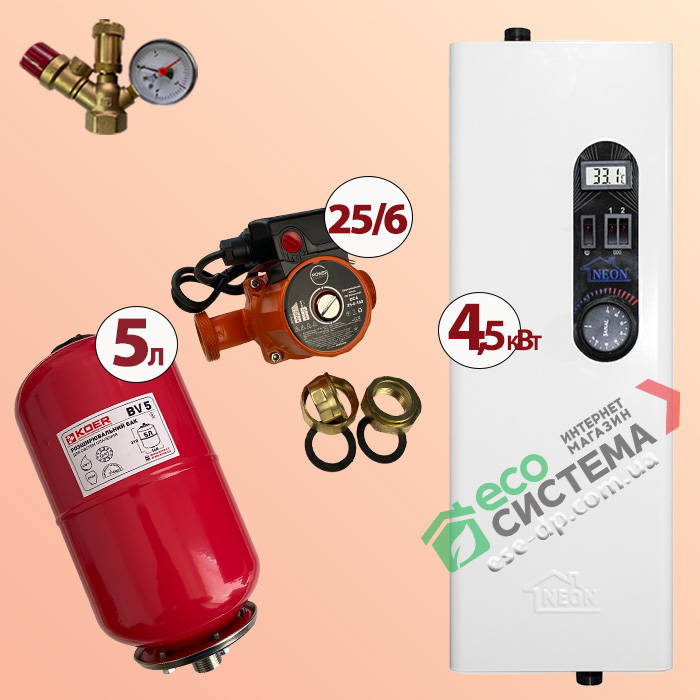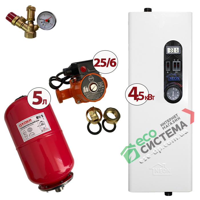 Электрические котлы NEON WCS_S 4,5 кВт (в комплекте с циркуляционным насосом, расширительным бачком и группой безопасности) – недорогое решение для отопления небольших домов до 45 м2.