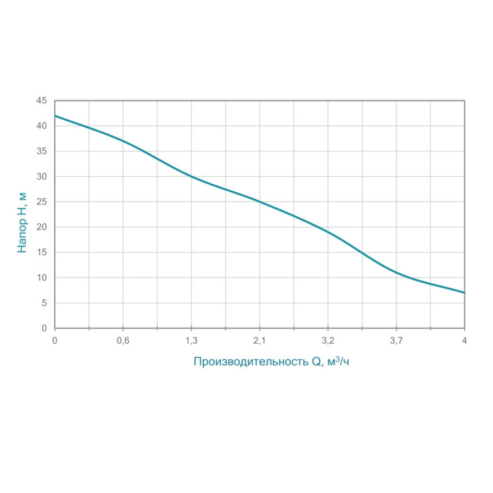 Н = 42 м, Q = 4,8 м3/ч (80 л/мин), Р = 750 Вт, глубина всасывания до 8 м, подключения 1” × 1”, корпус – чугун, рабочее колесо – полимер, обмотка – медь