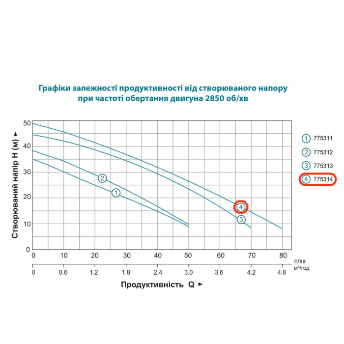 Н = 48 м, Q = 4,8 м3/ч (80 л/мин), Р = 1200 Вт, глубина всасывания до 8 м, подключения 1” × 1”, крышка корпуса – нержавеющая сталь, рабочее колесо – полимер