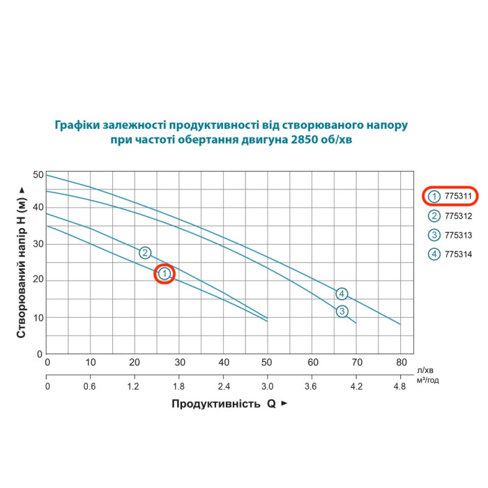 Н = 35 м, Q = 3,0 м3/ч (50 л/мин), Р = 600 Вт, глубина всасывания до 8 м, подключения 1” × 1”, крышка корпуса – нержавеющая сталь, рабочее колесо – полимер