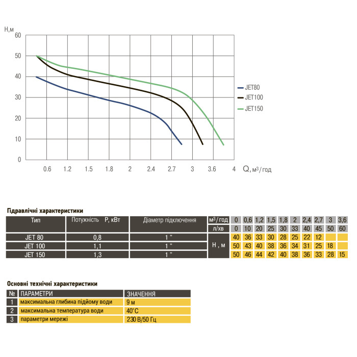 Н = 50 м, Q = 3,6 м3/ч (60 л/мин), Р = 1300 Вт, глубина всасывания до 9 м, подключение G1-B, рабочее колесо – полимер
