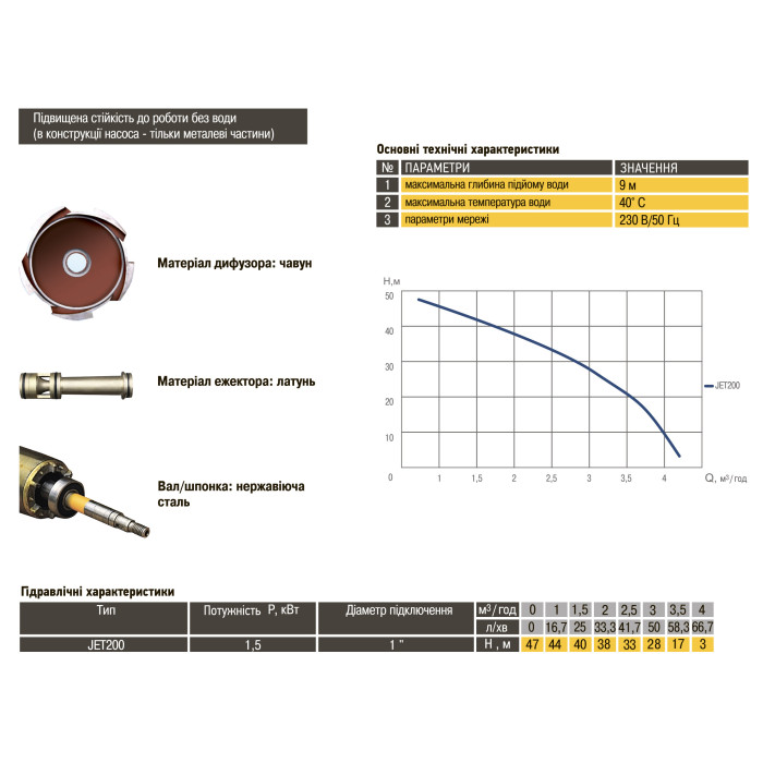 Н = 47 м, Q = 4 м3/ч (66 л/мин), Р = 1500 Вт, глубина всасывания до 9 м, подключение G1-B, рабочее колесо – латунь
