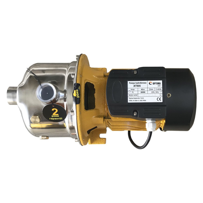 Насос Optima JET80S относится к центробежному самовсасывающему типу и оснащён одним рабочим колесом. Формирование напора происходит за счёт центробежной силы, возникающей при вращении рабочего колеса и воздействии его лопаток на перекачиваемую жидкость. Забор воды с глубины до 9 метров обеспечивается встроенным эжектором (трубкой Вентури), расположенным в корпусе насоса.
