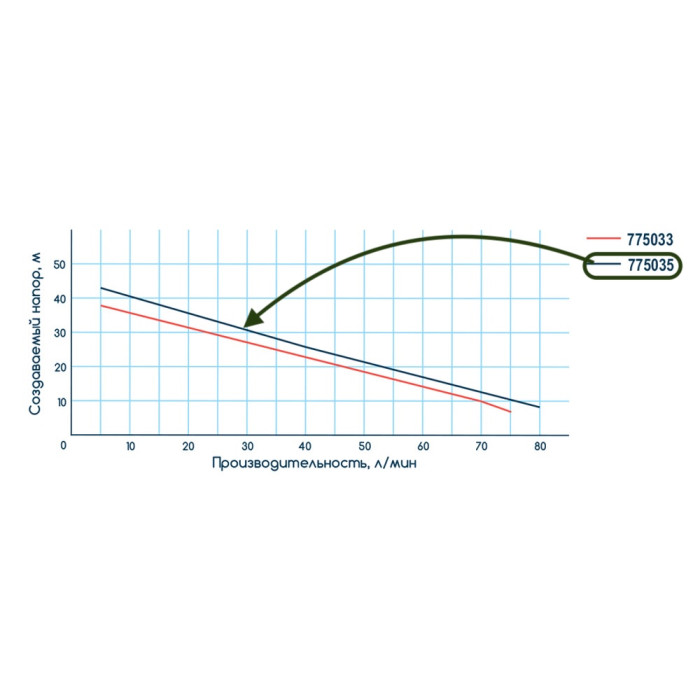 Н = 45 м, Q = 5,1 м3/ч (85 л/мин), Р = 1100 Вт, глубина всасывания до 8 м, подключения 1” × 1”, корпус – чугун, рабочее колесо – полимер, обмотка – алюминий