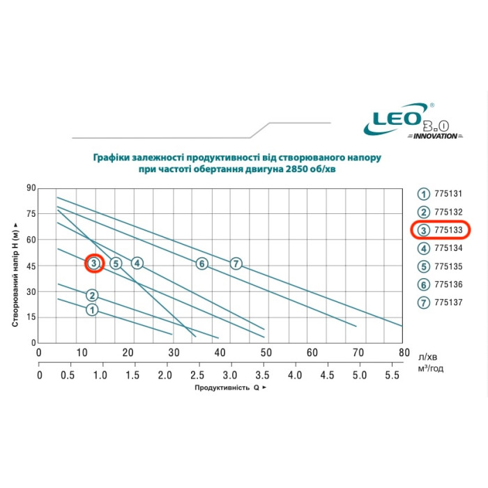 Н = 60 м, Q = 3,0 м3/ч (50 л/мин), Р = 600 Вт, глубина всасывания 5 м (до 8 м), диаметры патрубков 1”F × 1”F