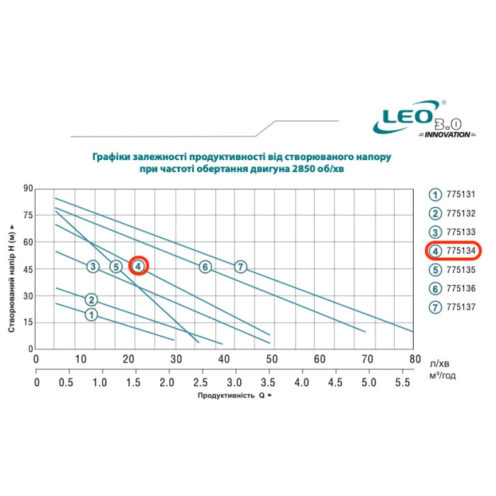 Н = 75 м, Q = 3,0 м3/ч (50 л/мин), Р = 750 Вт, глубина всасывания 5 м (до 8 м), диаметры патрубков 1”F × 1”F