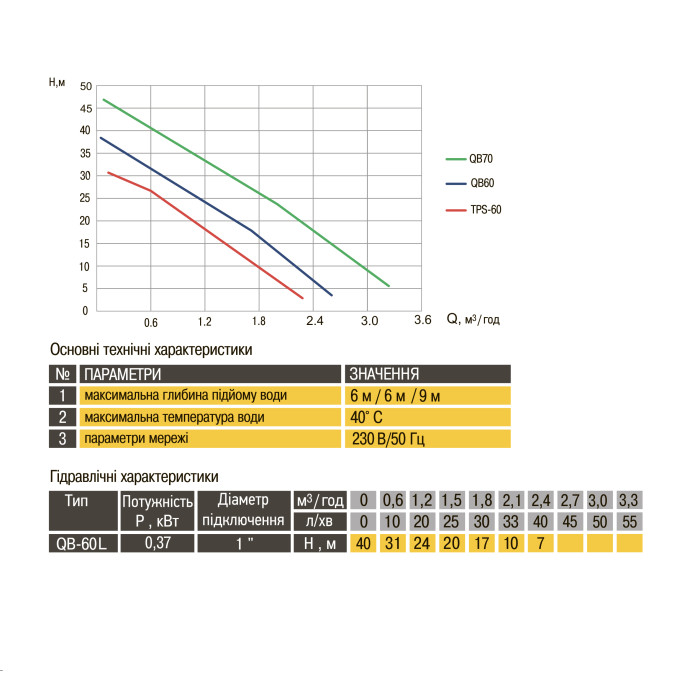 Н = 40 м, Q = 2,3 м3/ч (38 л/мин), Р = 370 Вт, глубина всасывания до 6 м, подключение G1-B