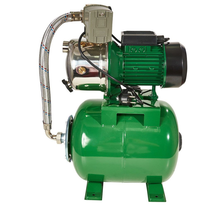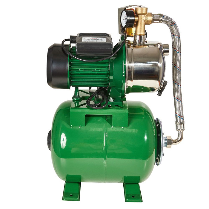 Бытовая насосная станция NOWA AJY 1100-5060-24 – комплект оборудования на основе поверхностного центробежного самовсасывающего насоса NOWA JY 1100-5060 с гидроаккумулятором на 24 л, автоматикой управления насосом и пятерником.