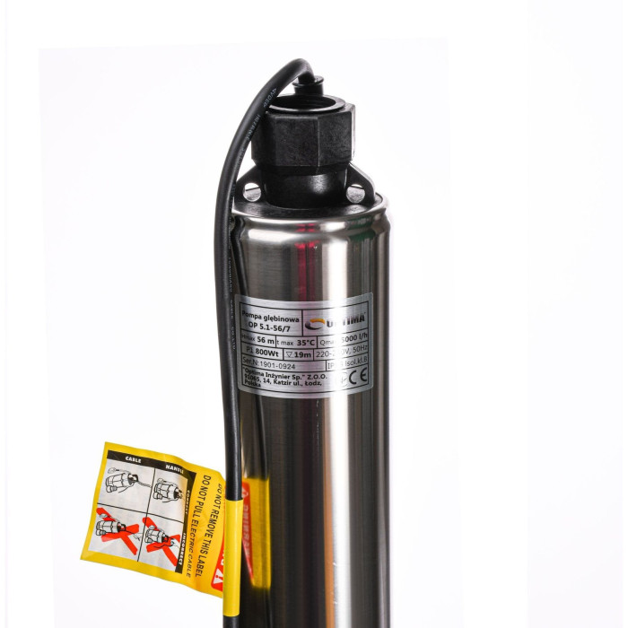 Н = 56 м, Q = 5 м3/ч (83 л/мин), Р = 800 Вт, подключение G1¼”, кабель 10 м, погружение до 20 м, без поплавка
