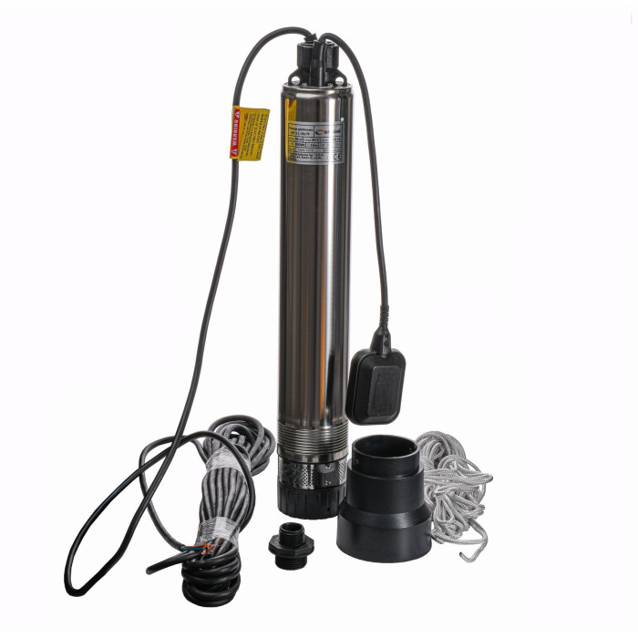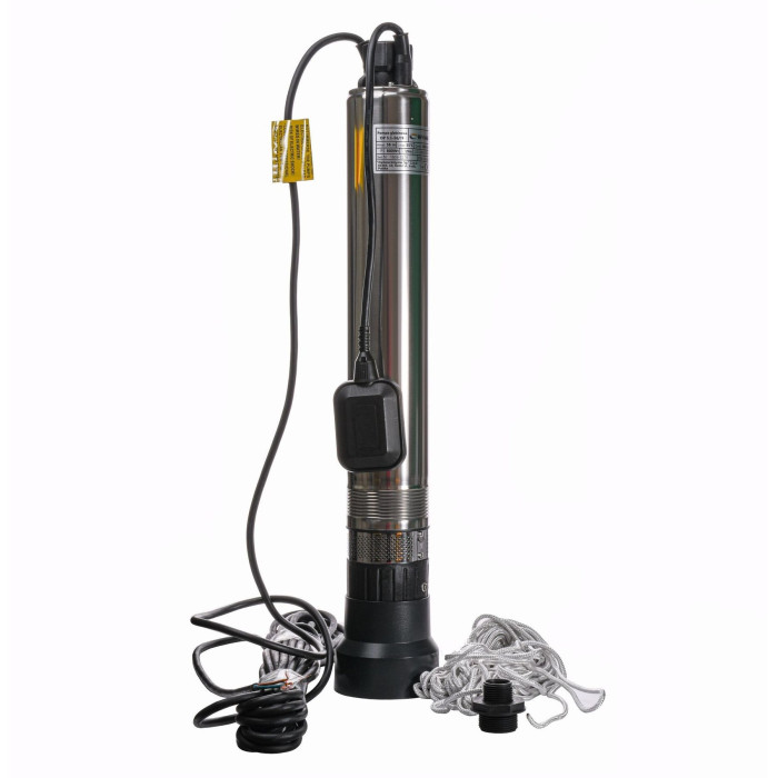 Н = 56 м, Q = 5 м3/ч (83 л/мин), Р = 800 Вт, подключение G1¼”, кабель 10 м, погружение до 20 м, поплавок