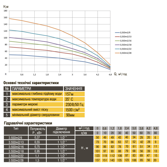 Диаметр корпуса 3,5” (87 мм), Н = 123 м, Q = 4,8 м3/ч (80 л/мин), Р = 1500 Вт, подключение G1½”, пульт, кабель 15 м, погружение до 100 м