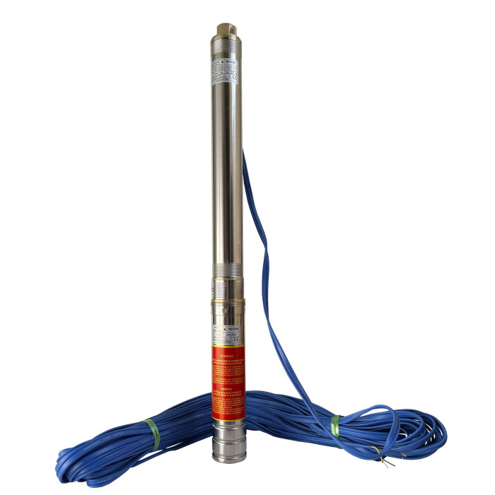 Н = 61 м, Q = 2,7 м3/ч (45 л/мин), Р = 370 Вт, подключение G1”, пульт, кабель 35 м, погружение до 56 м