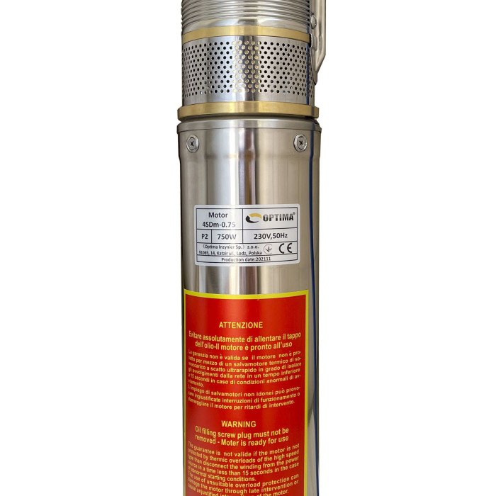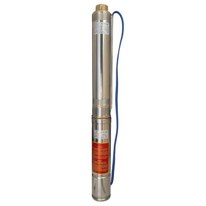 Диаметр корпуса 4” (100 мм), Н = 80 м, Q = 5,4 м3/ч (90 л/мин), Р = 750 Вт, подключение G1½”, пульт, кабель 1,5 м, погружение до 75 м