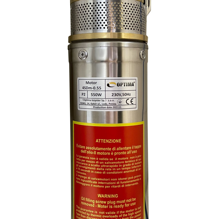 Диаметр корпуса 4” (100 мм), Н = 65 м, Q = 5,4 м3/ч (90 л/мин), Р = 550 Вт, подключение G1½”, пульт, кабель 35 м, погружение до 60 м