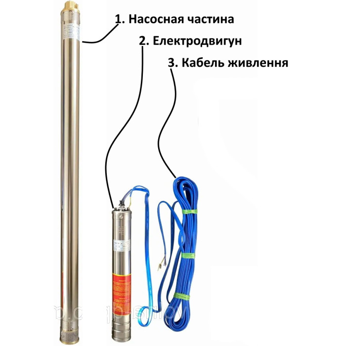 Диаметр 3,5” (87 мм), Н = 55 м, Q = 4,8 м3/ч (80 л/мин), Р = 370 Вт, подключение G1½”, кабель 1,5 м, погружение до 50 м