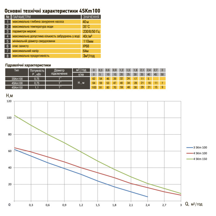 Н = 60 м, Q = 3,0 м3/ч (50 л/мин), Р = 750 Вт, подключение G1”, пульт, кабель 20 м, погружение до 20 м