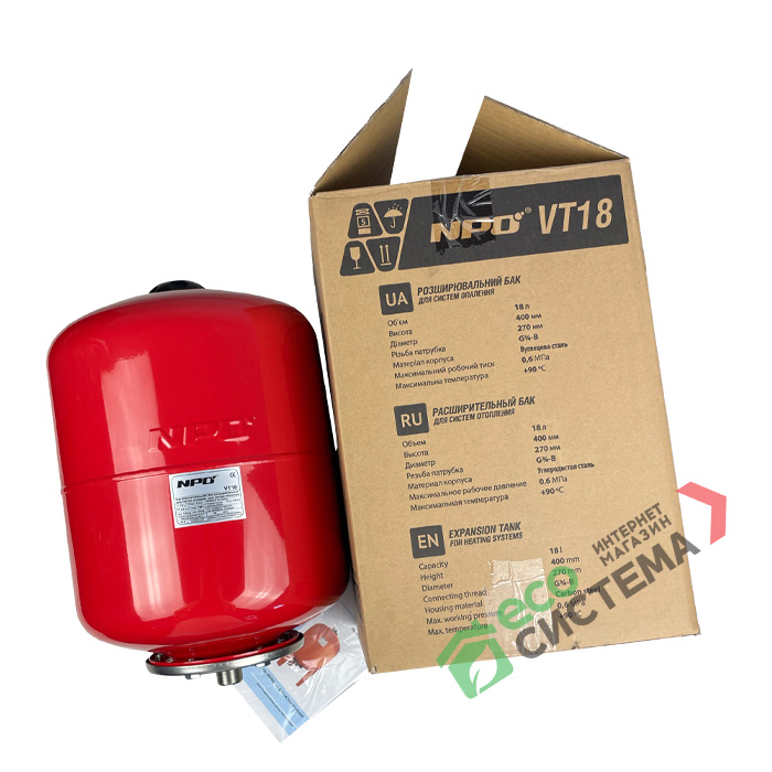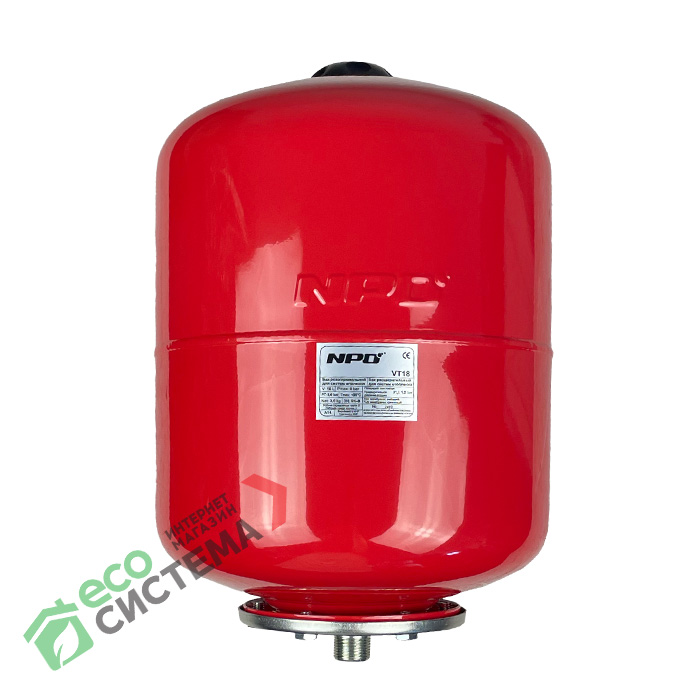 Круглий розширювальний бачок NPO VT об'ємом 18 літрів призначений для компенсації розширення обсягу води (теплоносія) та забезпечення постійного тиску в замкнутих системах опалення загальною ємністю до 180 л.