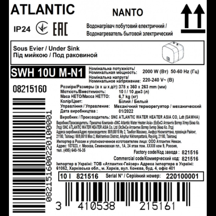 Atlantic Nanto SWH 10U M-N1 — компактный накопительный электрический водонагреватель малого объема 10 л с механическим управлением от французского бренда Atlantic. Бойлер разработан специально для небольших помещений и идеально подходит для установки под мойкой или в ограниченном пространстве. Бойлер отличается современным кубическим дизайном, который в 2024 году получил престижную награду Red Dot Design Award за инновационность, эргономику и долговечность.