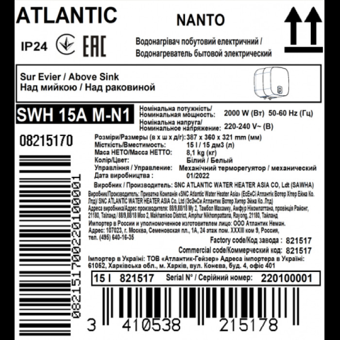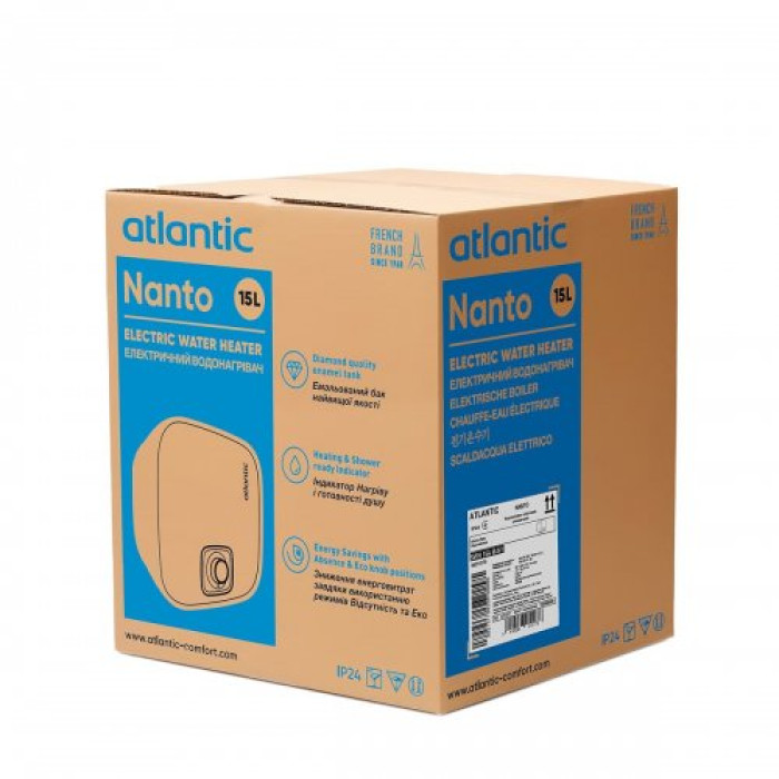 Atlantic Nanto SWH 15A M-N1 — компактный накопительный электрический водонагреватель малого объема 15 л с механическим управлением от французского бренда Atlantic. Бойлер разработан специально для небольших помещений и идеально подходит для установки над мойкой или в ограниченном пространстве. Бойлер отличается современным кубическим дизайном, который в 2024 году получил престижную награду Red Dot Design Award за инновационность, эргономику и долговечность.