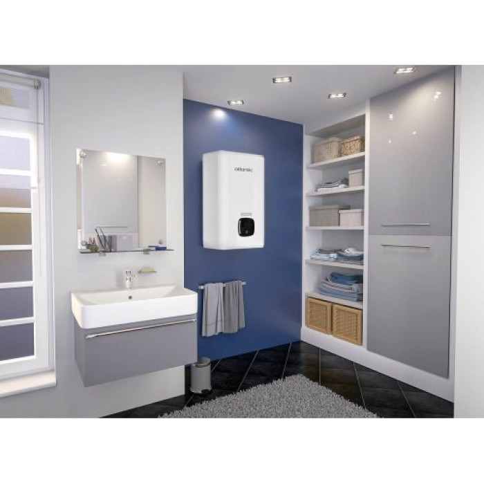 В каждом из двух разделенных баков Vertigo Steatite Essential установлен магниевый анод и сухой стеатитовый ТЭН: в первом на 1,5 кВт, а во втором на 1,0 кВт. Нагрев воды в емкостях происходит последовательно, что позволяет быстро нагреть горячую воду в первом баке, и, не дожидаясь нагревания всего объема, приступить к использованию горячей воды. Даже, если вода была совсем холодной, всего 50 минут и можно принимать душ.