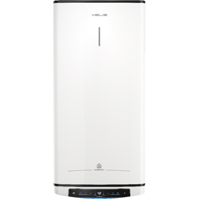 Ariston VELIS PRO DRY WIFI 80 EU – настенный накопительный водонагреватель объемом 65 л. Предназначен для быстрого нагрева воды для кухни, душевой или ванной на 3-х человек. За счет призматической формы с мелкой глубиной 27,5 см органично вписывается в интерьер помещения.