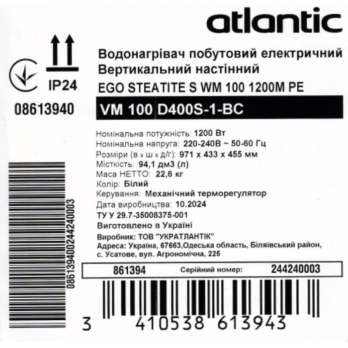 Электрический бойлер накопительного типа ATLANTIC EGO STEATITE VM 100 D400S-1-BC – водонагреватель объемом 94,1 л с экономичным сухим стеатитовым ТЭНом на 1200 Вт. Предназначен для нагрева воды для кухни или душа. Настенный монтаж в вертикальном положении. Органично вписывается в интерьер помещения.