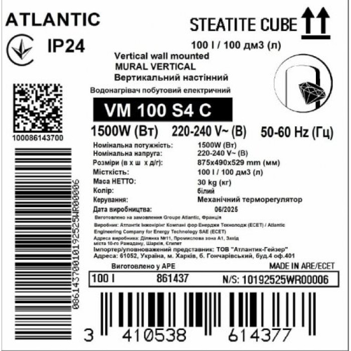 Электрический бойлер накопительного типа ATLANTIC STEATITE CUBE VM 100 S4 СМ 1500 W предназначен для нагрева 100 л воды для ванной или душа. Новый дизайн в форме призмы вписывается в самый изысканный интерьер квартиры или частного дома. Его легко можно встроить в мебель.