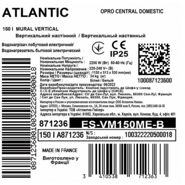 Atlantic Opro Central Domestic Wall Mounted 150 ES-VM150ME-B (2200W) — мощный напольный накопительный электрический водонагреватель, рассчитанный на объекты с высоким потреблением горячей воды.